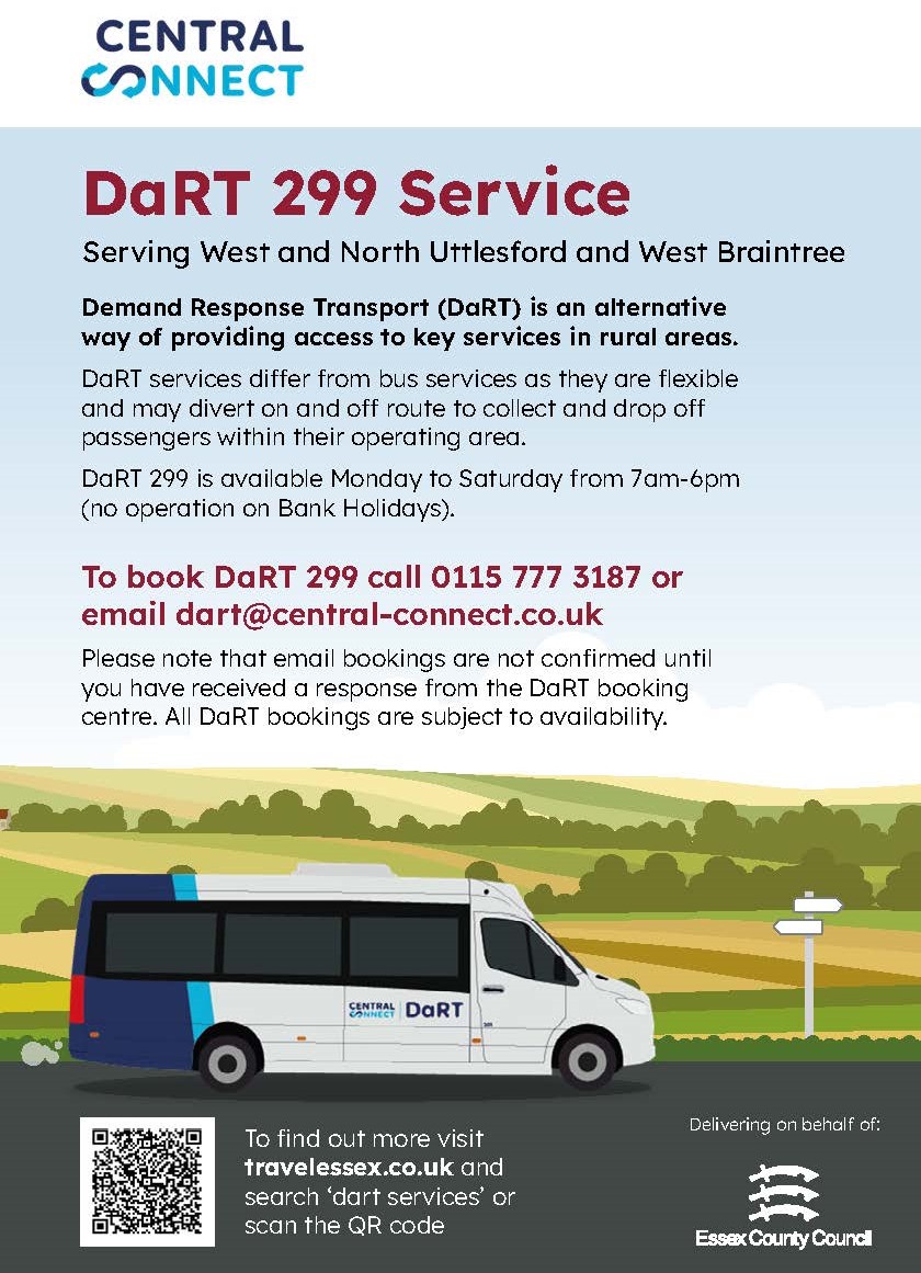 DaRT 299 is operated by Central Connect and serves passengers in rural areas of West and North Uttlesford and West Braintree, where access to conventional bus services may be limited.